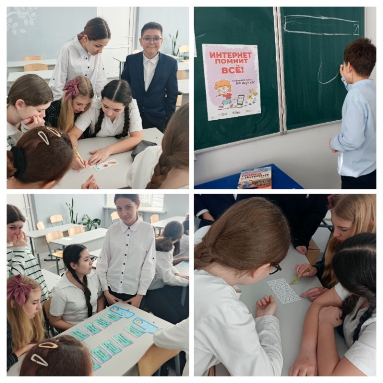 С помощью алгоритма присутствующие составляли правила безопасного выбора пароля для своих аккаунтов, искали зашифрованные слова, связанные с Интернетом, разгадывали ребусы, собирали правила поведения в сети. В конце урока ребята познакомились с книжной выставкой «Интернет: безопасный, интересный, познавательный» и плакатами, подготовленными Лигой безопасного Интернета.