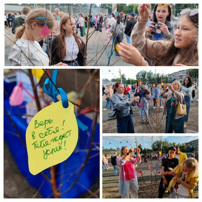 Присутствующим было предложено написать пожелание и напутствие для молодого поколения на «фруктах» и повесить на дерево добрых пожеланий.