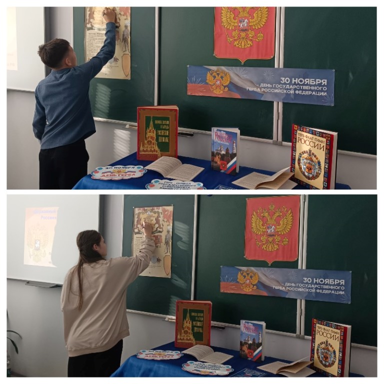 Школьники узнали, почему 30 ноября отмечается этот государственный праздник, кто выполнил рисунок современного герба РФ, какое описание государственного символа даёт Федеральный конституционный закон «О Государственном гербе РФ».