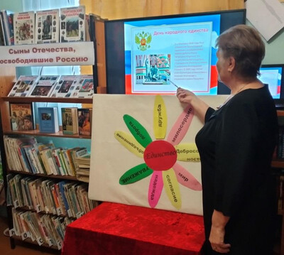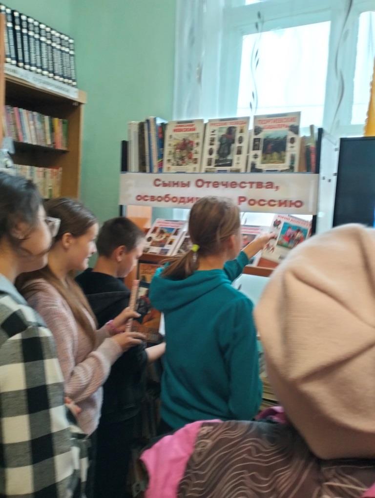 К мероприятию была оформлена книжная выставка «Сыны Отечества, освободившие Россию», на которой были представлены книги по истории России. В конце мероприятия школьники приняли участие в викторине о символах и государственных праздниках России.