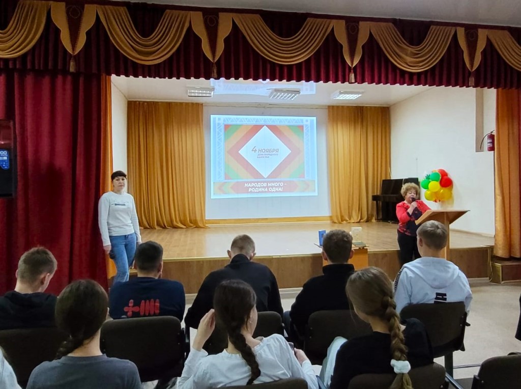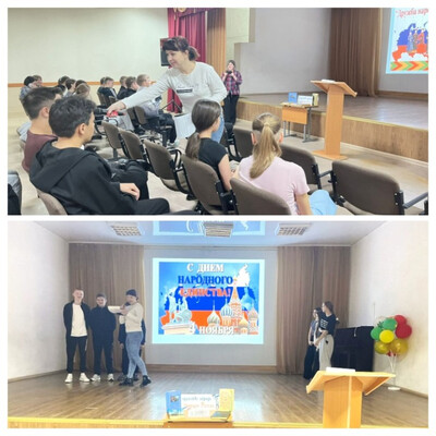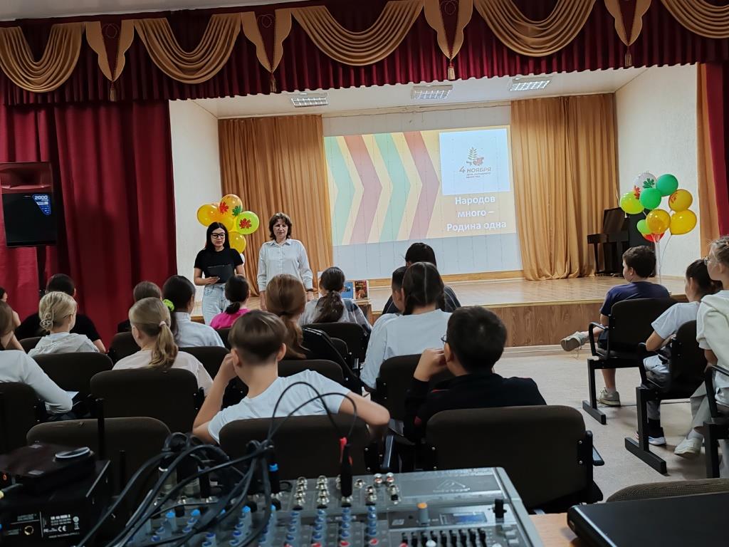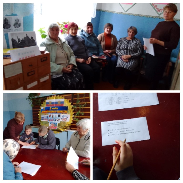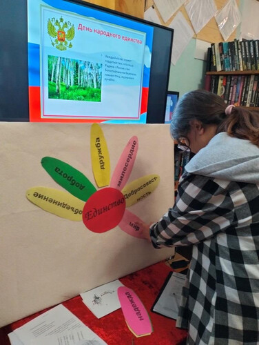 Ребята досказывали и собирали пословицы, отгадывали загадки о России, участвовали в исторической викторине «День народного единства». Для участия в викторине на сцену были приглашены представители команд: три девочки и три мальчика. Ребята отвечали  дружно и быстро. Победила дружба и сплочённость. Ведь в единении и сплочённости наша сила. Перед началом мероприятия демонстрировался видеоклип «Матушка земля» в исполнении Т. Куртуковой, в конце видеоролик «День народного единства». Прозвучали стихи Н. Меркушова «Четыре века пролетели», О. Емельяновой «Посрамив врагов коварство», С. Чирковой «Как здорово, что мы едины». Была представлена книжная выставка «В единстве народа - будущее России».