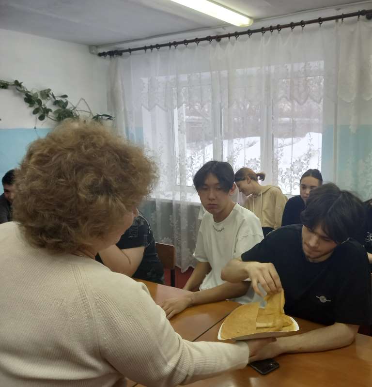 Студенты узнали, что означает каждый день из семи дней Масленичной недели. Между рассказом ведущих проходили конкурсные задания: «Продолжи пословицу», «Кто сильнее», «Самый быстрый», викторина «Масленица». Команда, победившая в викторине «Масленица», получила связку сушек.