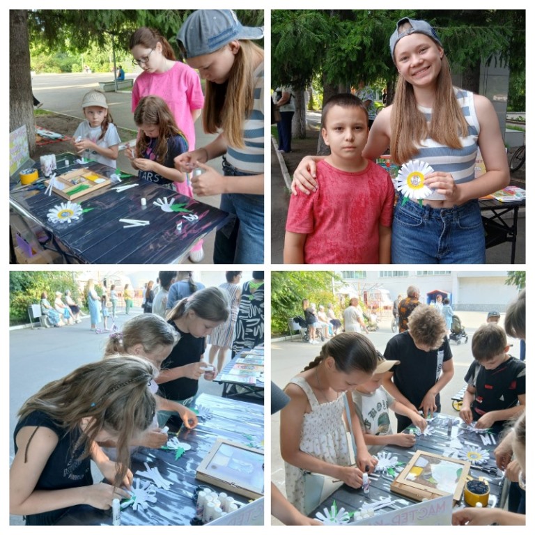 Для юных участников мероприятия библиотекари подготовили мастер-класс «Ромашка на счастье». В честь семейного праздника ребята с удовольствием изготовили его символ: пышный красивый полевой цветок украсил одежду многих присутствующих.
