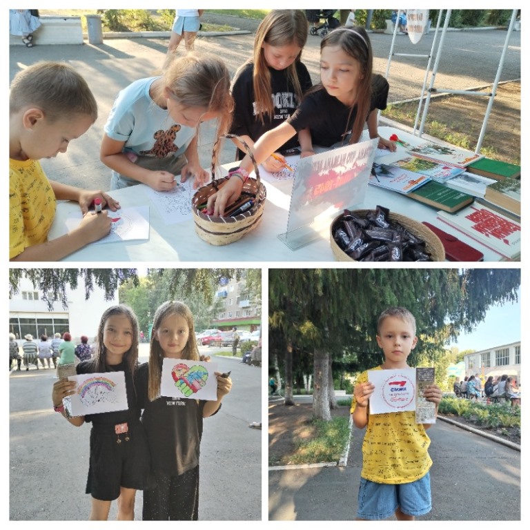 Ребята с помощью метания дротиков получали вопрос и, отвечая на него, зарабатывали сладкие призы и книжные закладки, также были подготовлены раскраски с цветными карандашами.