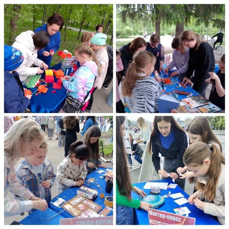 Не только дети, но и взрослые с большим интересом приняли участие в различных мастер-классах по изготовлению символов и атрибутов Великой Победы: гвоздик, книжных закладок в виде георгиевской ленты, поздравительных открыток, декоративного панно.