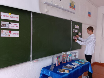 В практической части мероприятия учащиеся выполнили упражнение на знание профессий и специальностей, а также определили, какие профессии подходят каждому ученику в классе. В помощь школьникам была предложена книжная выставка «Цель. Выбор. Карьера». |